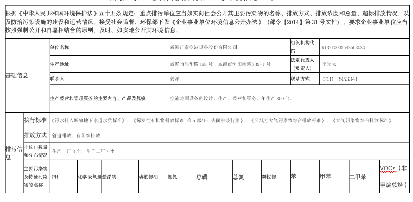 威海廣泰空港設(shè)備股份有限公司環(huán)境信息公示